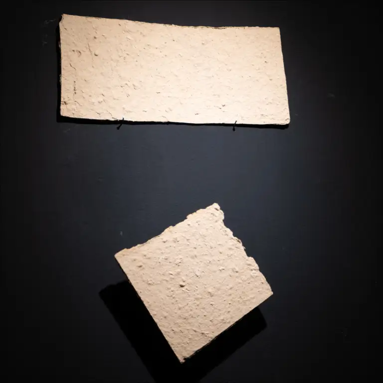 From woven canvases and delicate papers to solid hemp structures, each piece reveals the 'memory of the future' hidden within the seed.